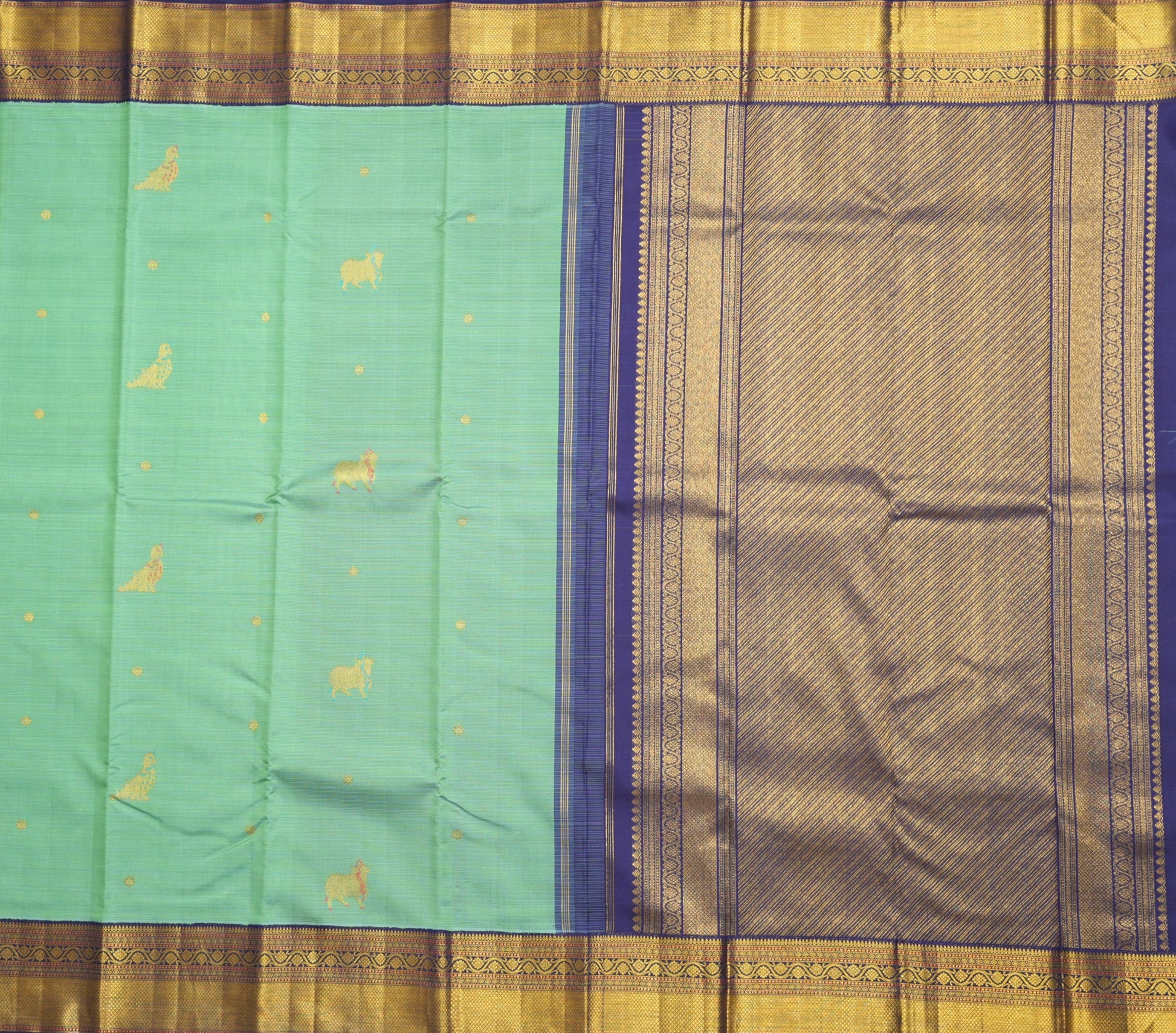 Color: Refreshing mint green body adorned with golden woven bull motifs