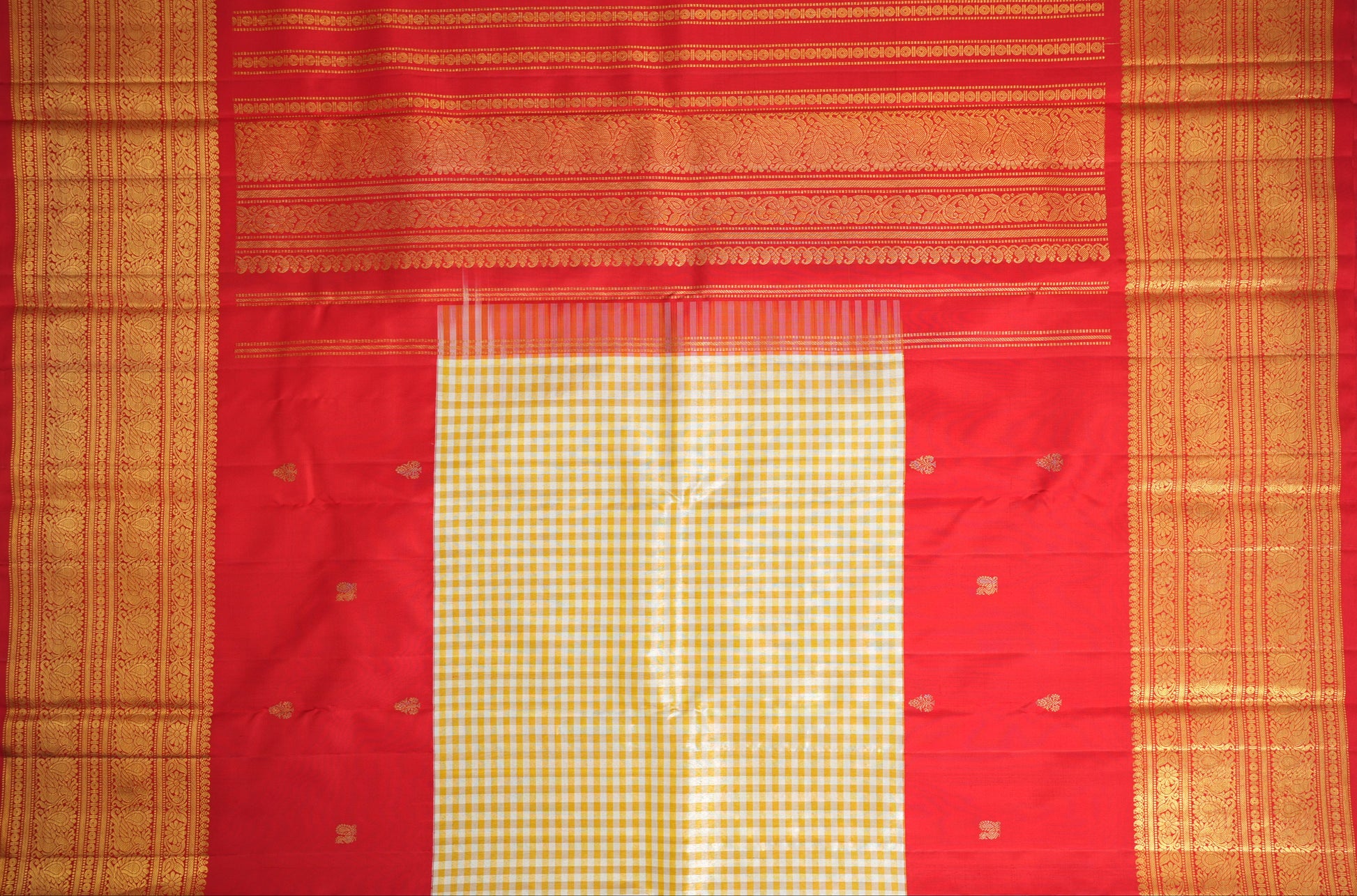 Design: Unique dual-pattern design featuring checks and solid red with minimal zari buttas