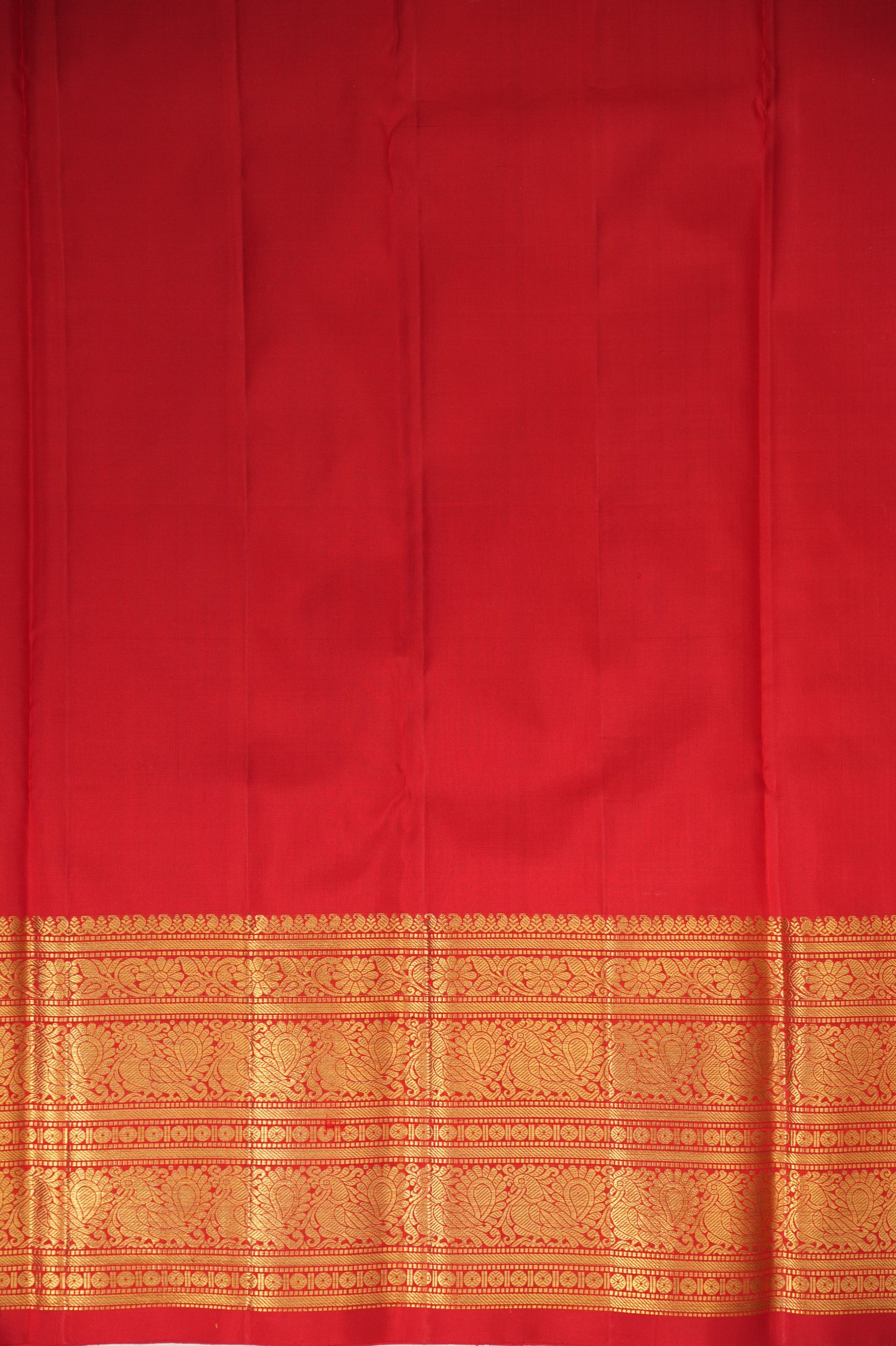 Border: Rich red border intricately woven with golden zari floral and peacock and floral motifs
